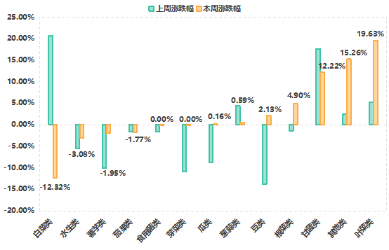 價(jià)格指數(shù)上升品類中:瓜類(0.16%)、豆類(2.13%)、根菜類(4.90%)蔬菜價(jià)格指數(shù)本期止跌為漲;蔥蒜類(0.59%)與甘藍(lán)類(12.22%)蔬菜價(jià)格指數(shù)本期漲幅有所收窄;其他類(15.26%)與葉菜類(19.63%)蔬菜價(jià)格指數(shù)本期漲幅有所擴(kuò)大。