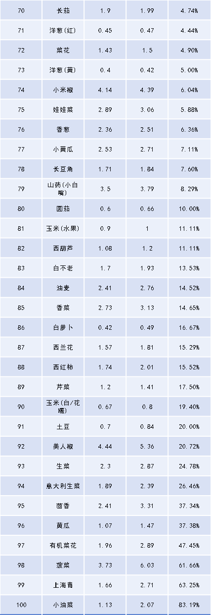 從具體蔬菜品種來看,本期價(jià)格上漲的蔬菜有41種,占總蔬菜品種41.00%,其中小油菜本期均價(jià)2.07元/斤,上期均價(jià)1.13元/斤,環(huán)比漲幅達(dá)83.19%;價(jià)格下跌的蔬菜有34種,占總蔬菜品種34.00%,其中小白菜本期均價(jià)1.10元/斤,上期均價(jià)1.87元/斤,環(huán)比下降41.18%;本期價(jià)格持平的蔬菜有25種。